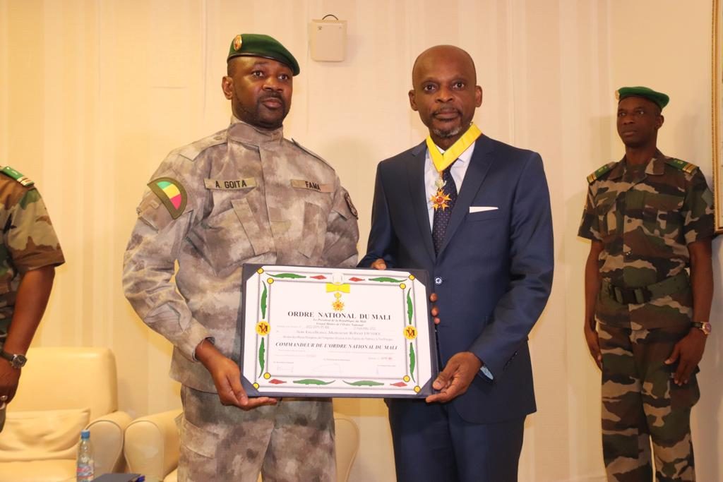 En marge de sa visite de travail effectué du 10 au 11 mai 2023 à Bamako, le ministre des affaires étrangères, de l’intégration régionale et des Togolais de l’extérieur, le Prof. Robert DUSSEY a été décoré par le Colonel Assimi GOÏTA, Chef de l’État et Président de la Transition en République du Mali, « Commandeur de l’Ordre national du Mali à titre étranger » en guise de reconnaissance de ses efforts diplomatiques et de médiation dans l’intérêt supérieur du peuple malien et au service de la paix et de la stabilité sous-régionale.