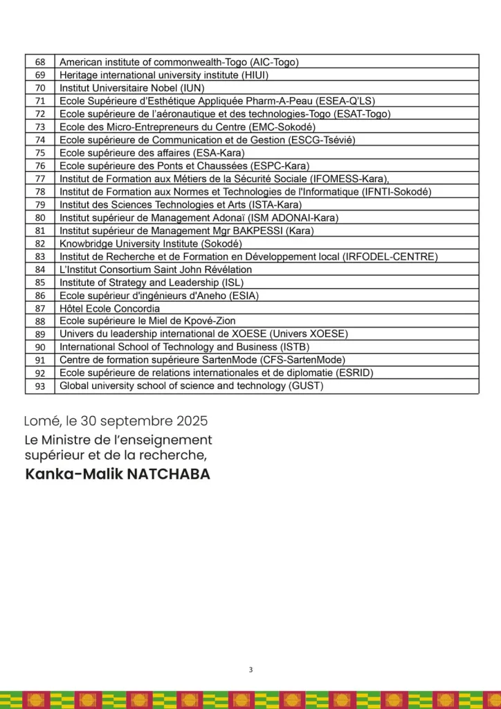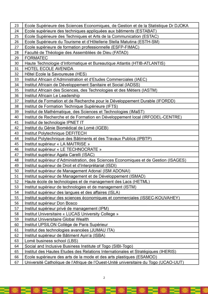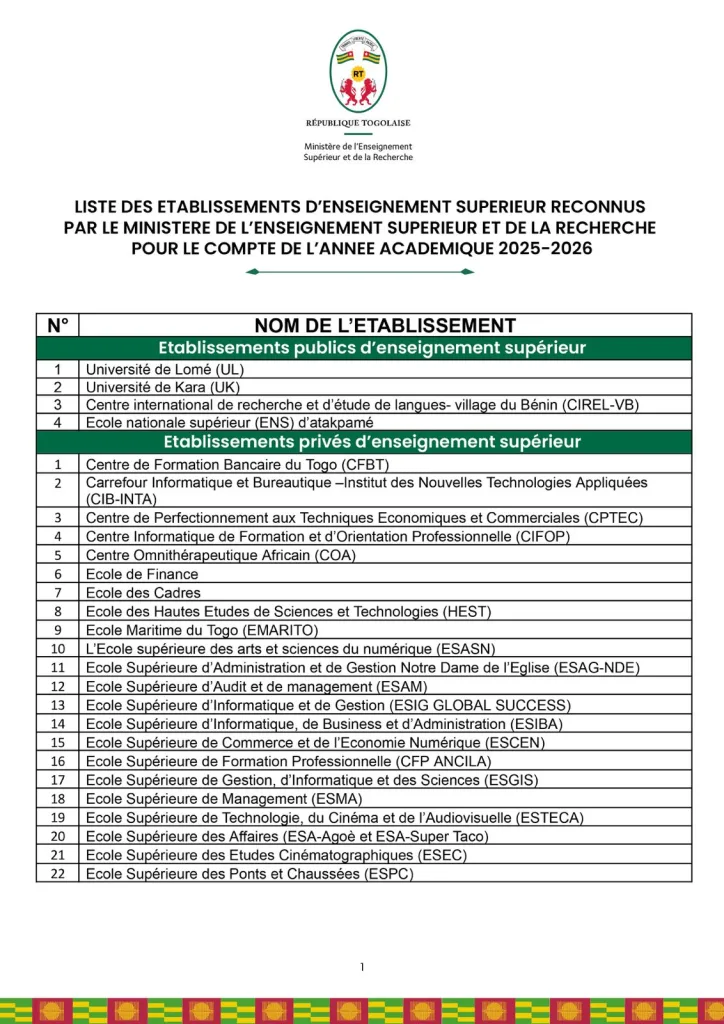(TOGODAILYNEWS) – Dans la perspective de la rentrée académique 2025-2026, le ministère de l’enseignement supérieur et de la recherche a rendu public la liste des établissements privés d’enseignement supérieur, reconnus et agréés par l’État. Les étudiants et leurs parents sont invités à consulter cette liste afin de sécuriser leur choix d’inscription.