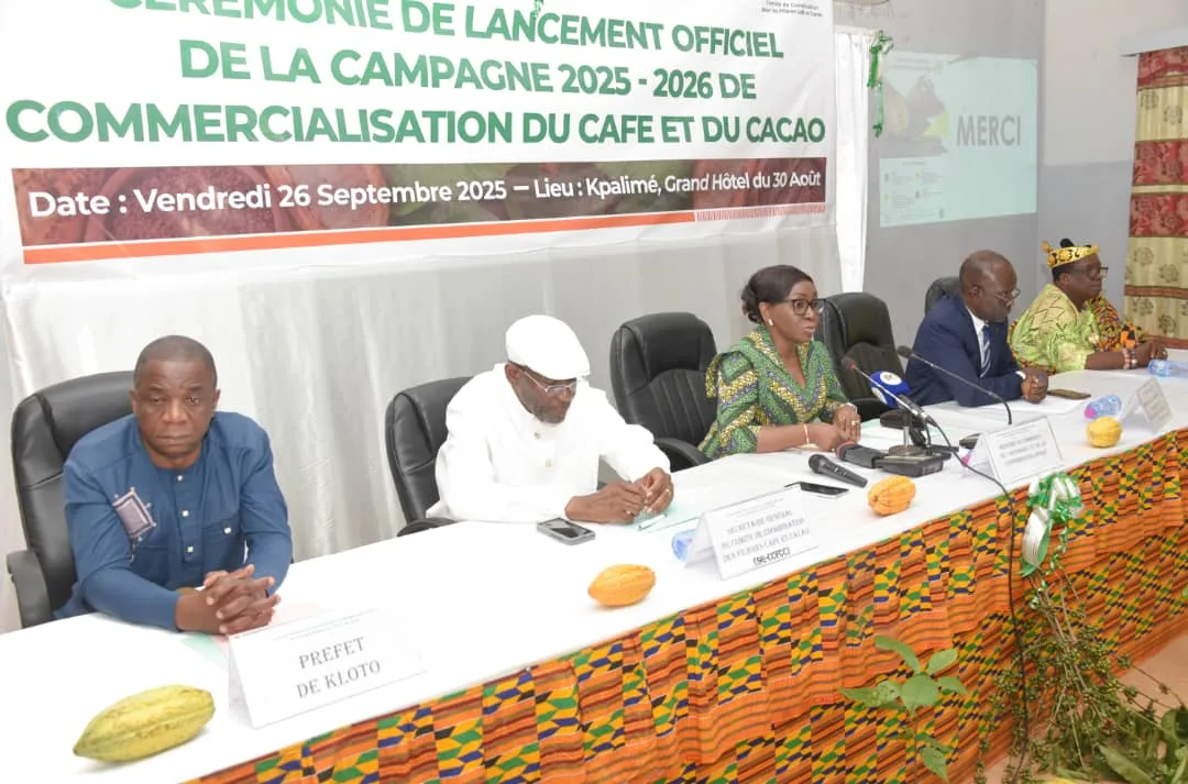 (TOGODAILYNEWS) – Le Comité de Coordination pour les filières Café et Cacao (CCFCC), a procédé le vendredi 26 septembre 2025, à Kpalimé, au lancement de la campagne de commercialisation 2025-2026 du café et du cacao au Togo. C’était au cours d’une cérémonie présidée par Rose Kayi Mivedor-Sambiani, ministre du Commerce, de la Consommation locale et de l’Artisanat, en présence du Représentant le ministre de l’Agriculture, de l’Hydraulique Villageoise et du Développement Rural, le directeur de cabinet, Dindiogue Konlani, du Secrétaire général du CCFCC, Enselme Gouthon, des autorités locales, des chefs traditionnels, des représentants des producteurs et transformateurs.