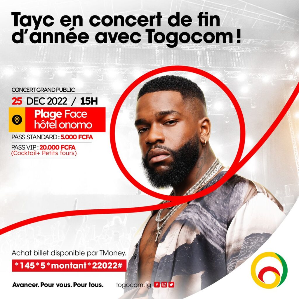 Annoncé en concert de fin d’année par Togocom les 24 et 25 décembre 2022, à Lomé, Tayc est au Togo depuis le jeudi 22 décembre 2022, ce qui prouve que le concert aura bel et bien lieu. Les choses se précisent pour un show inédit.