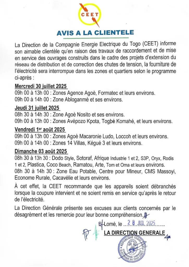 (TOGODAILYNEWS) – La Compagnie Énergie Électrique du Togo (CEET), dans un communiqué en date du 28 juillet 2025, informe sa clientèle qu’en raison des travaux de raccordement et de mis en service des ouvrages construits dans le cadre des projets d’extension du réseau de distribution et de correction des chutes de tension, la fourniture de l’électricité connaîtra des perturbations dans certains quartiers et zones périphériques de Lomé du 30 juillet au 03 août 2025.