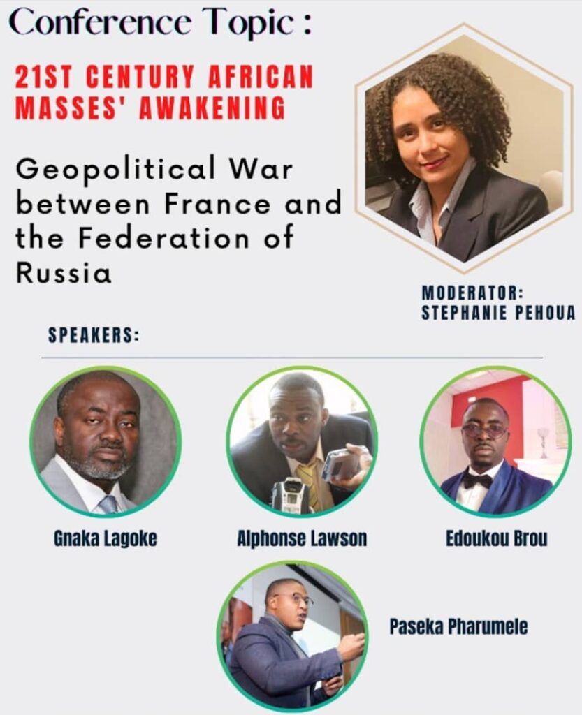 Centré sur le thème : LE RÉVEIL DES MASSES AFRICAINES AU 21ÈME SIÈCLE – LA GUERRE GÉOPOLITIQUE ENTRE LA FRANCE ET LA FÉDÉRATION DE LA RUSSIE, la conférence qui était modérée par Stephanie Pehoua et a vu trois orateurs principaux dont: Paseka Pharumele, membre de la Convention pour le Panafricanisme et le Progrès; Alphonse Lawson, président du Conseil d’Administration de l’Université de Saint-Boniface Winnipeg et le Dr Gnaka Lagoke, a éclairé sur les différents aspects de la guerre géopolitique qui se déroule entre la France et la Russie sur l’Afrique.