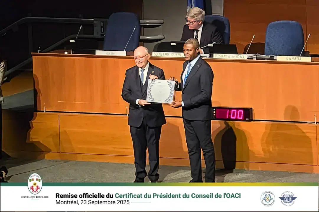 (TOGODAILYNEWS) – Suite à l’audit de sûreté USAP-CMA mené par l’OACI du 25 février au 6 mars 2025, au cours duquel le Togo a obtenu un taux de conformité exceptionnel de plus de 90 %, le Togo a reçu le mardi 23 septembre 2025, le certificat de reconnaissance du Conseil de l’Organisation de l’Aviation Civile Internationale (OACI), l’une des plus hautes distinctions dans le domaine de l’aviation civile mondiale.