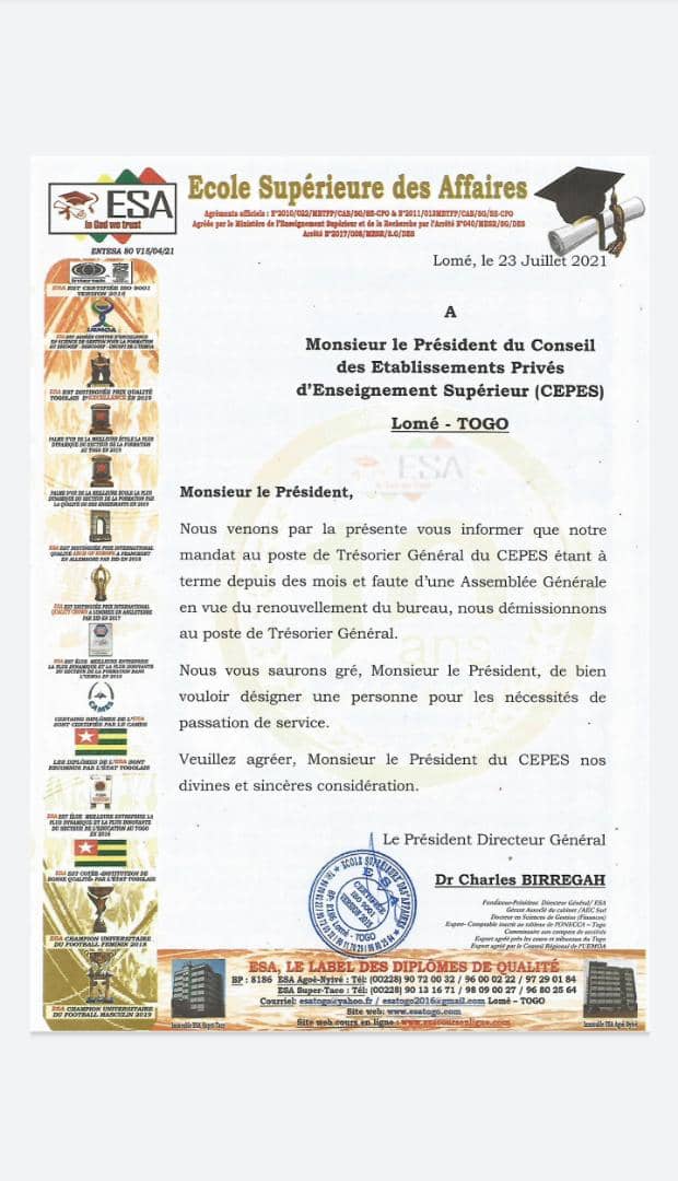 «Monsieur le Président, nous venons par la présente vous informer que notre mandat au poste de Trésorier Général du CEPES étant à terme depuis des mois et faute d’une Assemblée Générale en vue du renouvellement du bureau, nous démissionnons au poste de Trésorier Général », peut –on lire dans le courrier signé par Charles Birregah adressé à Marcel Akakpo.